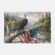 Ein Glatzenadler auf einem Baumzweig mit Blick auf einen Fluss mit amerikanischer Flagge