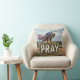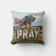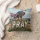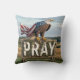 Auf einem rustikalen Holzschild mit der Aufschrift "PRAY", der mit grünem Blattwerk geschmückt ist, thront ein Glatzenadler mit amerikanischer Flagge