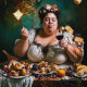 "Banquet of Chaos" surreal farbenfrohe Kunstwerke. Eine farbenfrohe surreale Satireaufnahme, die barocke Eleganz mit humorvollem Chaos verbindet. Fliegende Kuchen, Käse, Trauben, Wein und übertriebene Ausdrucksweisen erinnern an Glutton, Dekadenz und Spaß in einer lebhaften Szene.
