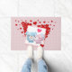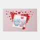 Doormat mit einem niedlichen Cartoon-Bild eines Bärenpaares, ein Bär ist pastellrosa mit einem kleinen Bogen und küsst die Wange eines blauen Bären, der sehr erfreut aussieht. Sehr niedlich und Kawaii. Viele rote Herzen schweben herum. Rosa Hintergrundfarbe mit weißem Polka Punkt Muster.