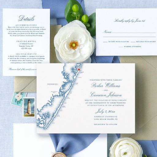 Celebrate your coastal New Jersey wedding with this elegant navy blue Long Beach Island map invitation, beautifully designed for a Barnegat Light, NJ celebration. Featuring refined typography and timeless seaside style, it’s perfect for LBI weddings at Barnegat Lighthouse State Park, Daymark Restaurant, Bonnett Island Estate, or Mallard Island Estate and Yacht Club. A sophisticated choice for a Jersey Shore wedding with nautical charm and classic coastal elegance. Artwork by Coastal Map Designs