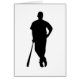 Eine einfache Silhouette in Schwarzweiß eines Baseballspielers bei Schläger. Er ist stehend und lehnt sich auf einen Baseballschläger. Fügen Sie diesem Design eine personalisierte Nachricht hinzu, oder ändern Sie die Hintergrundfarbe.