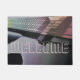 Bass-Gitarren-moderne Fußmatte-Fußmatte. Eine elektrische Bass-Gitarre mit den warmen farbigen Lichtern, die weg vom Hals sich reflektieren. Der Text sagt Willkommen, aber Sie kann es zu allem ändern, das Sie als es mögen oder verlassen. Ein wunderbarer Eingang zu einem musikalischen Haushalt oder zu einem Studio. Plus, macht er ein großes Housewarminggeschenk für Ihren Lieblingsbass-Spieler, Musiker oder Musikfreund.
