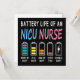 Humorous shift chart showing the battery life of a NICU nurse, also known as a neonatal intensive care unit nurse, with colorful levels from start to double shift. Ideal for neonatal nurses who enjoy relatable workplace humor.