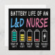 Humorous shift chart showing the battery life of an L&D nurse, also known as a labor and delivery nurse, with colorful levels from start to double shift. Ideal for maternity and birthing staff who enjoy relatable workplace humor.