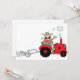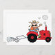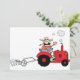 Das ist ein cooles Design eines Bauern auf einem Traktor. Der Bauer fährt einen roten Traktor und winkt aus. Der Traktor schleppt einen Pflug. Dieser Bauer auf einem Traktor-Design sieht großartig auf dieser Einladung aus