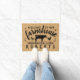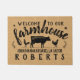 " Willkommen zu unserem Bauernhaus" Text mit 1 Kuh-Silhouette, 2 Hühner (1 Henne, 1 Hahn), plus einen Blatt Wreath und ein fallendes Blätter. Fügen Sie Ihren Familiennamen dieser rustikalen Bauernhausfußmatte des Chic mit einem Imitatleinwandhintergrund und schwarzen Silhouetten hinzu - vervollkommnen Sie für Bauern und Liebhaber des Bauernhofes schauen.