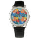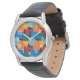 Diese Herren-Uhr hat ein Bauhaus-Design aus zufälligen Formen in blau, aquamarin, gelb, rot und orange.