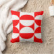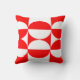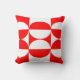 Dieses Kissen hat ein Bauhaus-Design von Quadraten und Kreisen in rot und weiß.