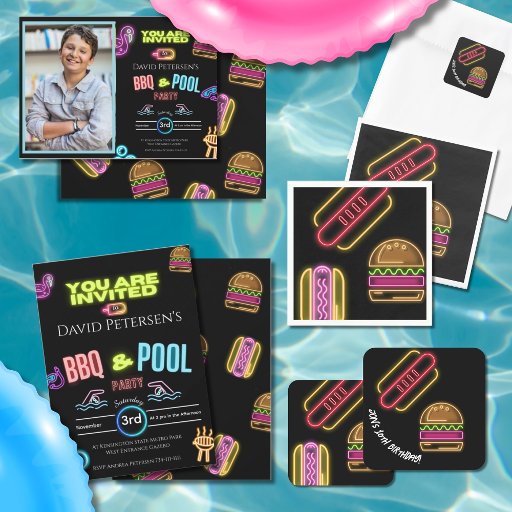 This Fun Neon Invitation features fun BBQ and pool themes front-and-back, and is hugely customizable, as text goes. If you need edits to Neon text, please message me. If you have shipping or post-order questions, please ask Zazzle, since I don't have access to that information.