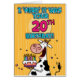 " Ich "lebe" es war Ihr 20. Geburtstag!" in Herden b-tägige Kuh des Spaßes, die eine Geburtstagskuchen-Grußkarte hält.