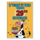 " Ich "lebe" es war Ihr 29. Geburtstag!" in Herden b-tägige Kuh des Spaßes, die eine Geburtstagskuchen-Grußkarte hält.