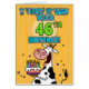 " Ich "lebe" es war Ihr 46. Geburtstag!" in Herden b-tägige Kuh des Spaßes, die eine Geburtstagskuchen-Grußkarte hält.