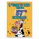 " Ich "lebe" es war Ihr 57. Geburtstag!" in Herden b-tägige Kuh des Spaßes, die eine Geburtstagskuchen-Grußkarte hält.
