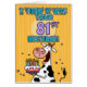 " Ich "lebe" es war Ihr 81. Geburtstag!" in Herden b-tägige Kuh des Spaßes, die eine Geburtstagskuchen-Grußkarte hält.