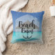 Ein quadratisches Kissen mit einem tropischen Bild eines türkisfarbenen Meeres mit einem weißen Sandstrand und einem Single mit Strohschirm. Typografie sagt Beach Bum.