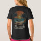 Ein junges Mädchen modelliert einen schwarzen T - Shirt mit einer Vintagen Grafik einer Sonnenuntergangsszene mit Palmen, einer Hängematte und Sandalen, und dem Text "Beach" unter dem Bild.
