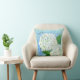 Handgemalt in Acrylfarben auf Leinwand von Audrey Jeanne Roberts, mischt diese lockere, malerische, weiße Hydrangea-Blüte tiefblau und Aquablau für einen erholsamen, friedlichen Blumenakzent im Stil der Hütte. Ein Paar weiße Hydrangeas mit Blattwerk werden mit dünnen braunen Zweigen über einem Aqua-blauen Holzboden kombiniert. Das Holzmuster ist auf der Rückseite vollständig sichtbar, wodurch das Kissen reversibel wird. Urheberrecht. Sammlung: Hütte am Ufer