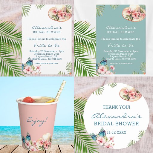 Passen Sie diese Bloral Beach Bridal Dusche ein, und fügen Sie Ihrer Feier eine schicke Touch hinzu. Die tropischen Hibiskus-Blume Pastel Pink, Beach Hut und Sonnenbrille, gegen einen duftenden blauen Hintergrund, sind ideal, um den Ton für einen Spaß in der Sonne, Chic Beach Wedding Shower Party oder Picnic Set.