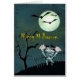 Halloween Illustration einer Mama in einer beängstigenden Nachtszene mit Vollmond, Totenbaum und Fledermäusen. Ein sehr detaillierter Halloween-Text in gelber Farbe und gruseliger Schriftart.
