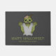 Dieses Halloween Thema Türmatte Features Desteis originelle Cartoon-Illustration eines beängstigenden grünen Zombie-Charakter, der seine Arme hoch hat und einige seiner Gehirne sichtbar ist. Unter dem Bild steht zum Beispiel "Happy Halloween!" zusammen mit einem personalisierbaren Textbereich für einen Familiennamen.