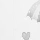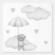 Wasserfarbener Teddybär mit einem Schirm, der in die Wolken treibt, mit Herz in Graustufen für neutrales Kinderzimmer.