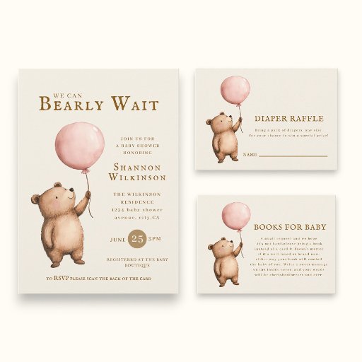 Celebrate your upcoming arrival with this adorable 'Bearly Wait' baby shower invitation. Featuring a sweet watercolor bear holding a pink balloon, this design sets a warm and inviting tone for your special celebration. The back of the card includes a QR code for easy RSVPs and event details, ensuring your guests can stay informed with a simple scan. This charming invitation is perfect for welcoming a new baby boy or girl into the world, and it adds a touch of whimsy to your special day.