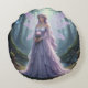 Eine wunderschöne Fee mit einem fließenden Lavendelkleid und eine Halskette aus Perlen mit Rose in ihren langen Lavendelhaaren und lila Libellen, die eine Rose tragen, steht in einem zauberhaften Wald, umgeben von blauen und violetten Blumen und moosbewachsenen Bäumen.