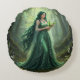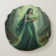 Eine schöne Fee mit einem fließenden grünen Kleid und eine Halskette aus Smaragden mit lily-of-the-tal Blättern in ihren langen smaragdgrünen Haaren und strahlend hellgrünen Libellen-Flügeln mit einer Lilie des Tales steht in einem zauberhaften Wald, umgeben von blauen und gelben Blumen, Lilien des Tals und moosbewachsenen Bäumen.