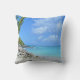 A pillow with a scenic tropical photograph. A secluded beach with white sand and turquoise water.