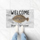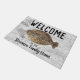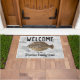 Willkommen auf der Zuhause "Ihr Familienname" oder wechseln Sie in die Hütte. Eine Begrüßungsmatte zum Thema Angeln für die Familie, die Lieben zum Fischen. Das Design ist mit einem Riesenflunder und einem rustikalen Hintergrund versehen. Diese Begrüßungsmatte ist perfekt für Zuhause, Hütte, Anhänger, Angelhütte etc.