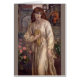Begrüßung von Beatrice von Dante Gabriel Rossetti, Ölgemälde auf der Leinwand 1880-1882, Prärahaelitmalerei der weiblichen Figur in einem langen weißen Gewand stehend inmitten von Blume vor einem grauen, mittelalterlichen gotischen Schlosshintergrund.
