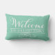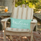 Das stilvolle Outdoor-Kissendesign "Welcome" in modernem, weißem Drehbuch mit eigenem Familiennamen und dekorativem Akzent. Die Farbe Minze / Meeresblau grüne Hintergrundfarbe, die an Ihre Gestaltung angepasst werden kann.