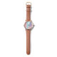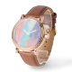 Die Pinselstrichgestaltung enthält mehrere Farben, die perfekt für eine braune, silberne oder goldene Uhr sind. Die Uhr ist als Herren-Uhr für ein übergroßes Aussehen und das hellbraune Armband aufgeführt, aber die Möglichkeit, eine Damen-Uhr zu wählen, ist vorhanden. Der Text ist in weißer Handschrift gestaltet. Die Zahlen 12, 3, 6 und 9 sind groß, während die anderen Zahlen kleiner sind. Es ist ideal für jeden, der Farbe liebt.
