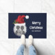 Personalisierbare Weihnachtsfotovorlage, bei der eine rote Weihnachtsmannmütze von Destei über einem runden Foto platziert wird. Die Weihnachtsmannmütze hat eine grüne Weihnachts-Holly-Pflanze und die Hintergrundfarbe ist blau. Es gibt auch zwei personalisierbare Textbereiche.
