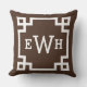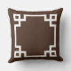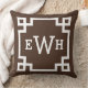 Das stilvolle und moderne Kissendesign mit quadratischem Akzent zeichnet sich durch ein griechisches geometrisches Rahmendesign und ein personalisiertes Monogramm aus. Dunkle Espressobraun-weiße Farben. Die Hintergrundfarbe kann geändert werden.
