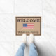 Dieser individuelle Türmatte oder Außenteppich zeichnet sich durch ein Bild der Fahne der USA in der Mitte auf einem beigefarbenen Hintergrund aus. Die Begrüßung "WELCOME" wird über dem Bild der Fahne gedruckt, mit einem Familiennamen, der am unteren Rand gedruckt ist. Die amerikanische Fahne weist schöne, fette rote und weiße Streifen mit weißen Sternen über dunkelblau auf.