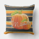 Schöner zeitgenössischer orangefarbener Kürbis auf einem hellen orangefarbenen, limitierten, grünen, weißen und schwarzen Streifen Muster Design. Mit der Möglichkeit, mit einem Familiennamen oder (begrenztem) Text Ihrer Wahl zu personalisieren oder anzupassen. Im warmen Herbstkissen im Freien können Sie Ihren Innenhof oder die Hüttenterwand mit einem Kissen schmücken und die Stimmung der Herbstsaison, des Erntedanks und Halloween genießen. Stilvolles rustikales Dekor Akzent Design für die Dekoration der vorderen Veranda oder Hof Ihres Landhauses Hütte, Blockhütte, Berghütte, Angellager, See- oder Flussurlaub Zuhause.