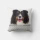 Personalisierbare und einfache Vorlage für das Foto eines Tieres auf einer grauen Hintergrundfarbe, die ein Muster von Pfoten mit weißem Hund aufweist. Es gibt auch einen personalisierbaren Textbereich für einen Namen oder einen anderen benutzerdefinierten Text unter dem Foto. Auf der anderen Seite des Kissens befindet sich das weiße Pfotenmuster auf grauem Hintergrund.