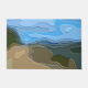 Ein helles, farbenprächtiges abstraktes Design mit Blick auf die Berge, mit blauem Himmel, Felsen und Bäumen.