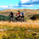 Eine Aquarell von drei Männern Mountainbiking in den walisischen Hügeln.