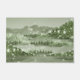 Abstrakte mediterrane Bergszene mit Seen gesäumt von immergrünen Bäumen und Vögeln und Glitzer-Fackel.