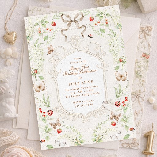 Celebrate a special first birthday with this elegant berry-themed invitation, featuring a delicate botanical wreath formed from soft florals, strawberries, and whimsical garden details.