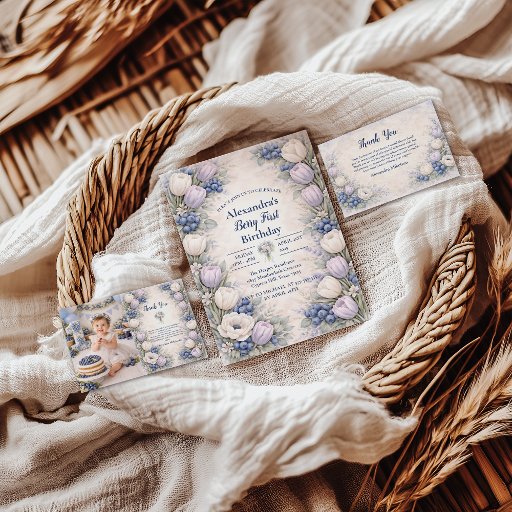 This soft blueberry garden collection features delicate florals and mixed berry details arranged in a romantic storybook frame. The airy ivory background and muted blue tones create a timeless, elegant look perfect for a Berry First celebration. Designed to feel refined yet playful, this collection works beautifully for garden parties, spring celebrations, and sweet first birthdays with a classic botanical aesthetic.