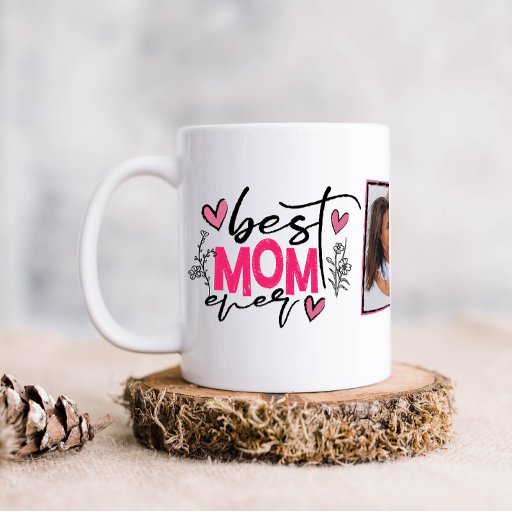 Beste Mama je Typografie Foto Tasse. Design bietet Single-Foto und trendige Typografie-Skripte in Rosa und Schwarz. Perfektes Geschenk für Mama.