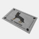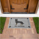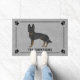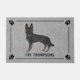 Desteis originelle Cartoon-Illustration eines schwarzen, zweifarbigen deutschen Schäferhundes. Die Hintergrundfarbe ist grau mit einer dekorativen Textur. Die Textur kann entfernt werden, und die Hintergrundfarbe kann auf Wunsch in jede andere Farbe geändert werden. Das Design ist durch einen stilistischen Rahmen gerahmt. In jeder Ecke gibt es auch eine Silhouette zum Hundepflaster. Unter dem Hundebild befindet sich ein personalisierbarer Text für einen Familiennamen oder einen anderen benutzerdefinierten Text wie z.B. "welcome".