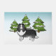 Desteis originelle Cartoon Illustration einer niedlichen schwarz / schwarz / weiß Fellfarbe Shetland Sheepdog / Sheltie Rasse Hund. Der Hund ist in einer kalten Winterszene untergebracht. In der Szene schneit es im Hintergrund und hinter dem Hund stehen drei grüne Tannen. Die Bäume haben Schnee auf ihnen. Der Hintergrund ist ein hellblau bis weiß Gradienten, die dieses Design, dass Frost kalten Winter-Tag aussehen.