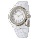 Eine ultrafeminine Armbanduhr mit weißem Band und Rhinestones-Einstellrad. Der Stil dieser Uhr kann so verändert werden, dass sie Ihren Bedürfnissen Anzug. Der Hintergrund dieser Uhr hat große Zahlen, was ein transparentes Bild ist, das es Ihnen ermöglicht, Ihr eigenes Bild in den Hintergrund zu laden, wenn Sie gewollt haben.