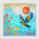 Dieses wunderschöne Design zeigt einen blauen und goldenen Vogel, der eine Landung auf einem goldenen Baum mit einem schönen Himmel mit vielen blauen Farben und einer kühlen orangen Sonne.