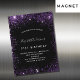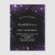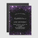 Eine mädchenhafte und weibliche 21. (oder jedes Alter) Geburtstagsfeier Einladung. vorne: Ein schicker schwarzer Hintergrund. Dekoriert mit dunklen lila Imitaten Glitzer Staub. Personalisieren und fügen Sie einen Namen und Party-Details hinzu. Der Name wird mit einem handgeschriebenen Stilskript geschrieben, mit lila, hellen Buchstaben.